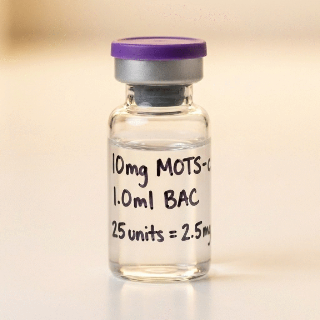 - Show vial with Sharpie markings: “10mg MOTS-c, 1.0ml BAC, 25 units = 2.5mg”