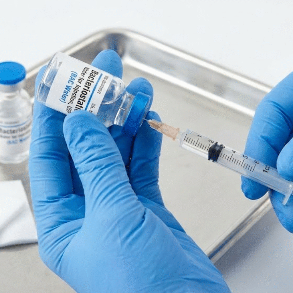 Bacteriostatic water (BAC water). This is what you’ll use to reconstitute the peptide powder. It’s just sterile water with a preservative to keep it stable.