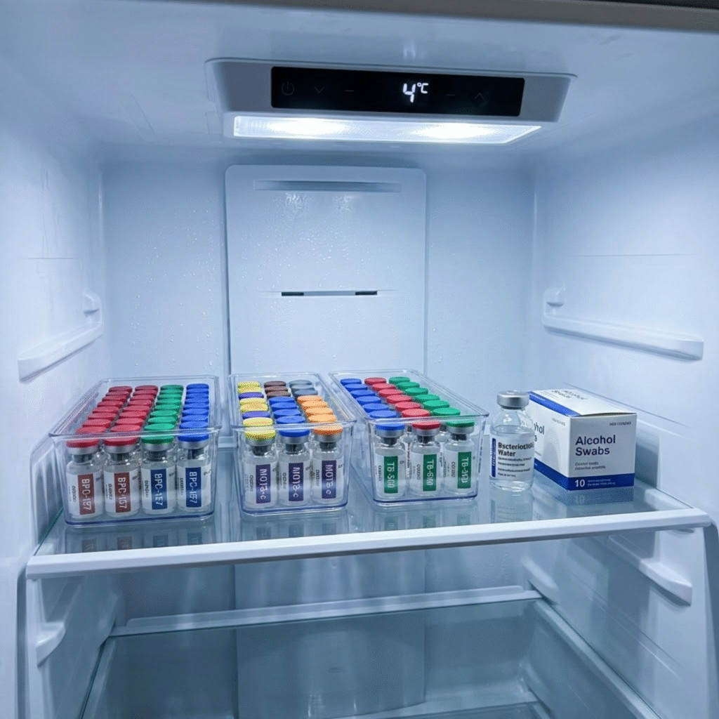 Store peptide vials in the refrigerator. Do not freeze. Most peptides stay stable for at least a year this way.